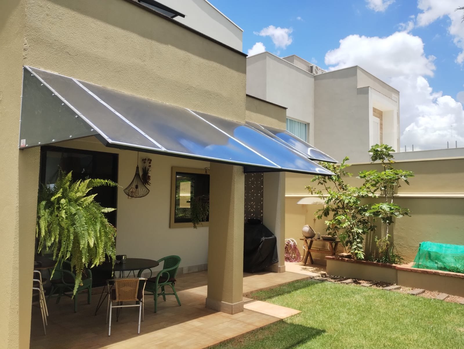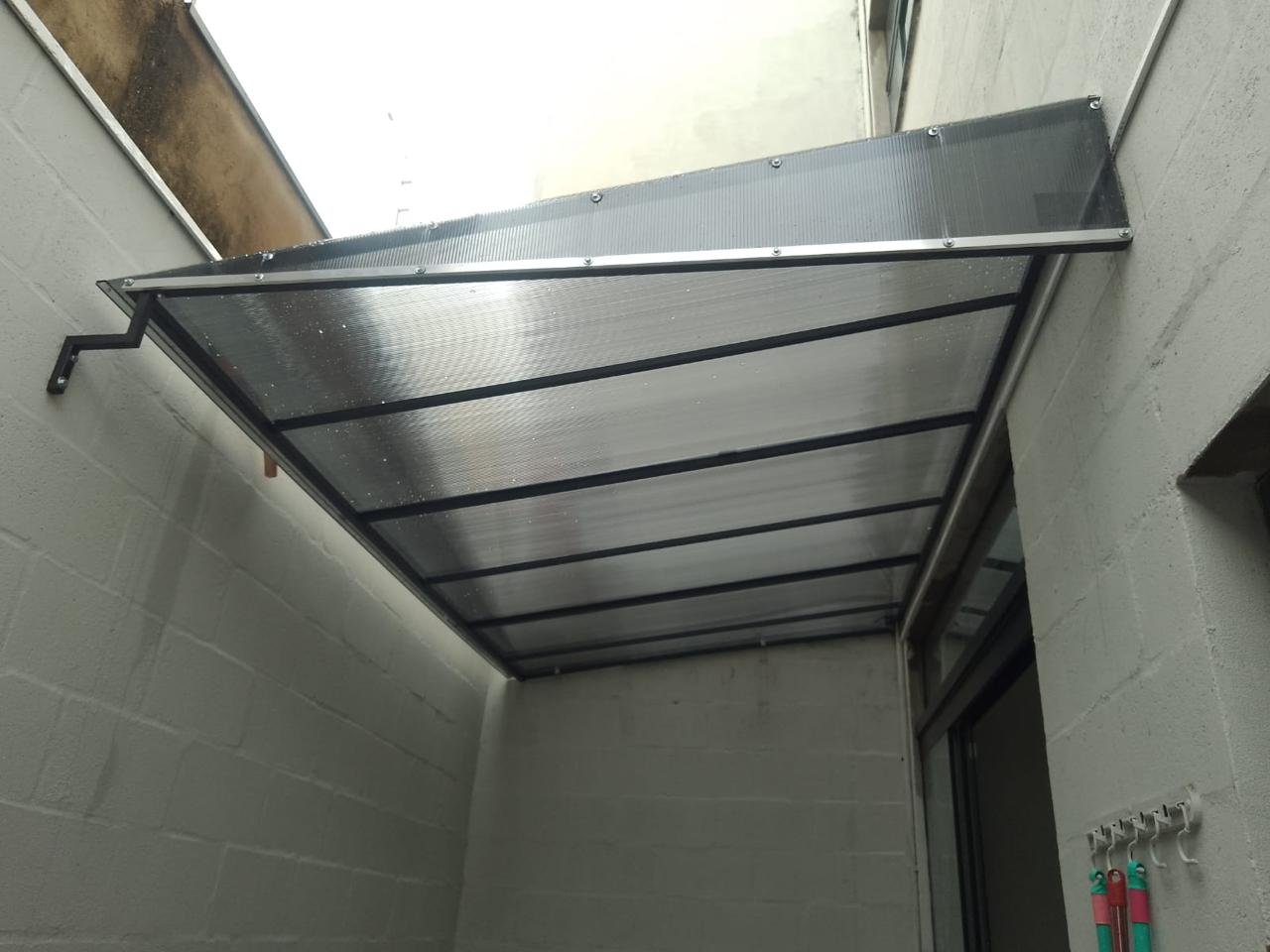 Corredores externos são áreas que costumam acumular água da chuva. Com a instalação de um toldo de policarbonato, o espaço permanece protegido e funcional.